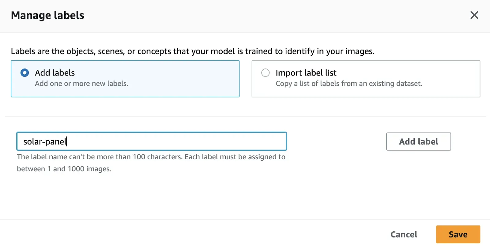 Next, click the “Add labels” button to create labels for use in annotating. For this project, we will create one label: “solar-panel”. Create the labels you need for your project.