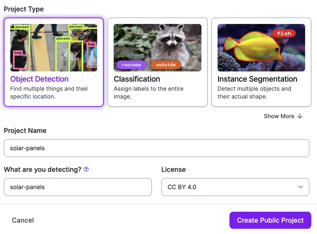 Go to the Roboflow dashboard and click the “Create a Project” button. A form will appear asking you to select a project name, the type of object(s) you want to identify, and a project type. Provide the requested information, then click “Create Project”.