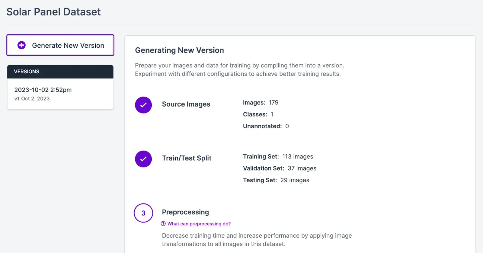 Once you have labeled your data, click “Versions” in the sidebar of the Roboflow product to generate a project version. Here, you can preprocess your data and apply augmentations. Learn more about preprocessing and augmentation best practices.