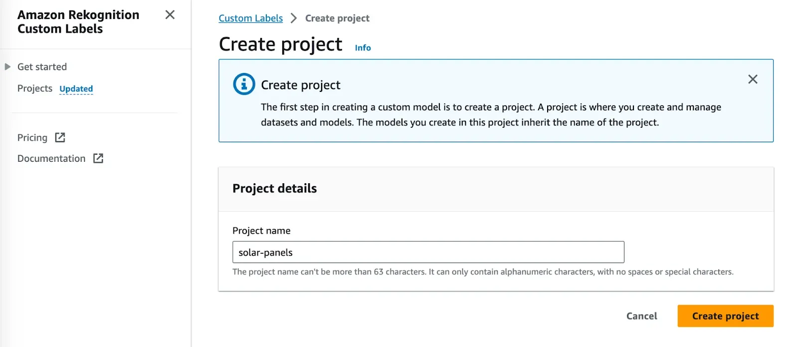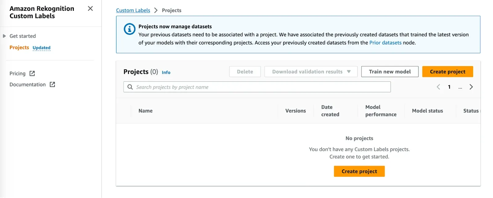 Next, click “Use custom labels” in the Rekognition sidebar and then click “Projects”. Here, you can create a project. Click “Create project” to create a project.