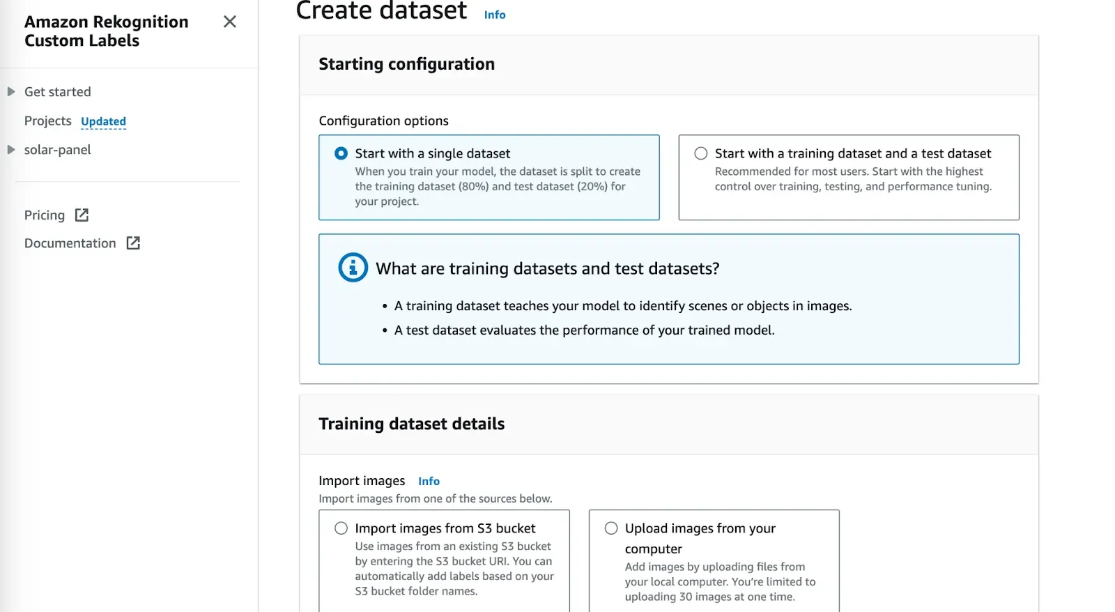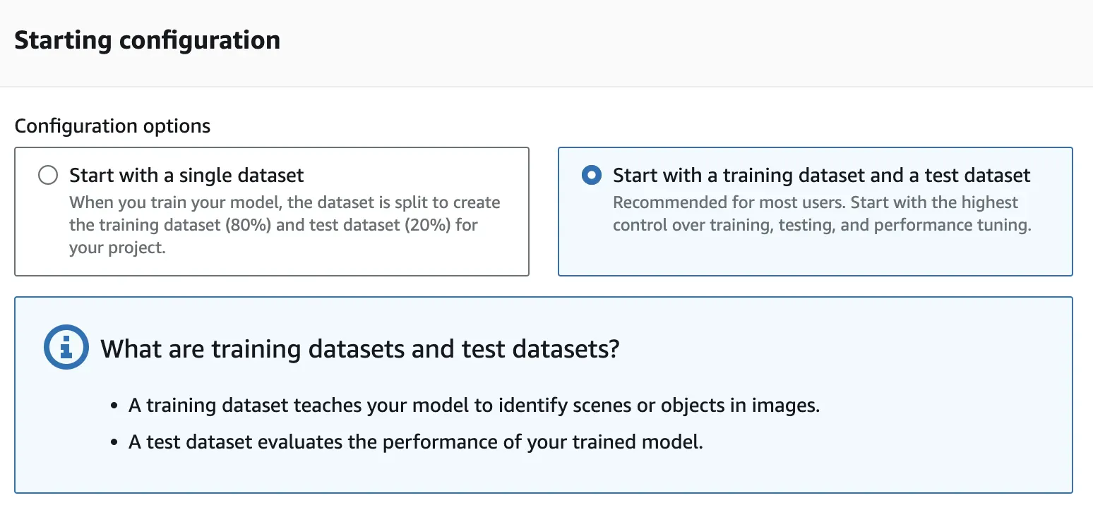 Return to the dataset creation page we opened in another tab earlier in the tutorial. Select the “Start with a training dataset and a test dataset” option: