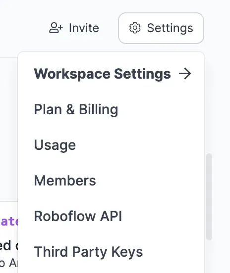 In a new tab, go to the Roboflow dashboard and click “Settings”, then click “Third party keys”.