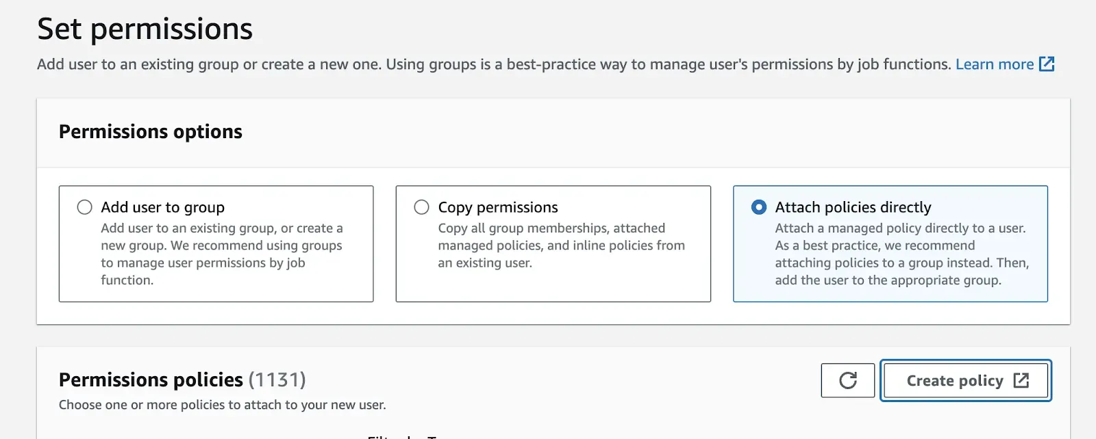On the Third party keys page, follow the link to create a programmatic access user. This user should have permission to write to S3. During user set up, click the “Attach policies directly” option then click “Create policy”.
