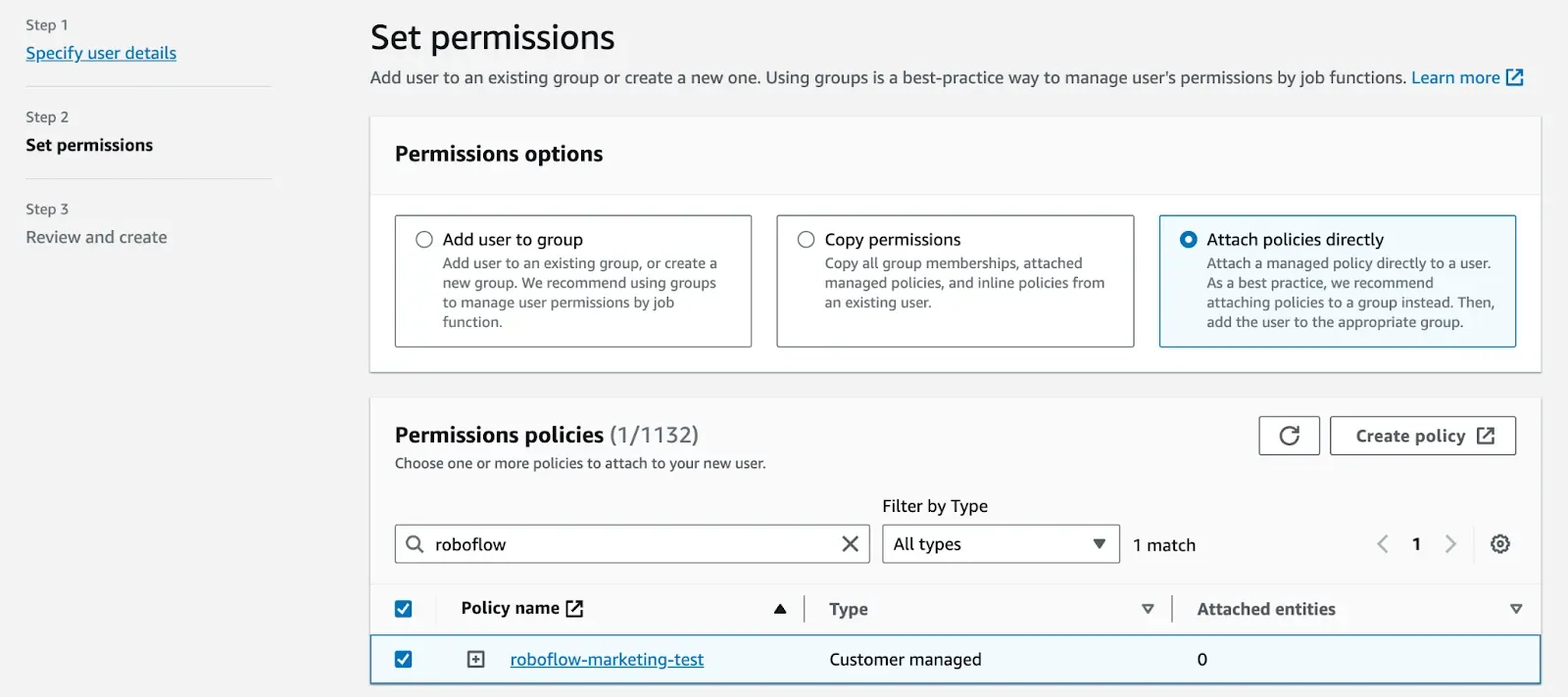 Copy the policy in the “these IAM policies” link on the Roboflow dashboard into a new policy: