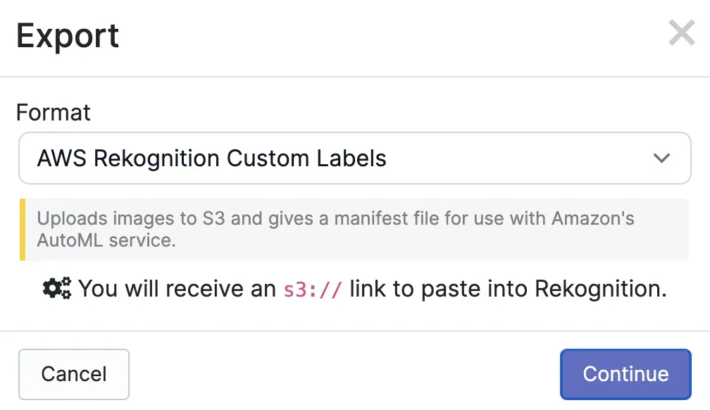 Click the “AWS Rekognition Custom Labels” export option, then click “Continue”.