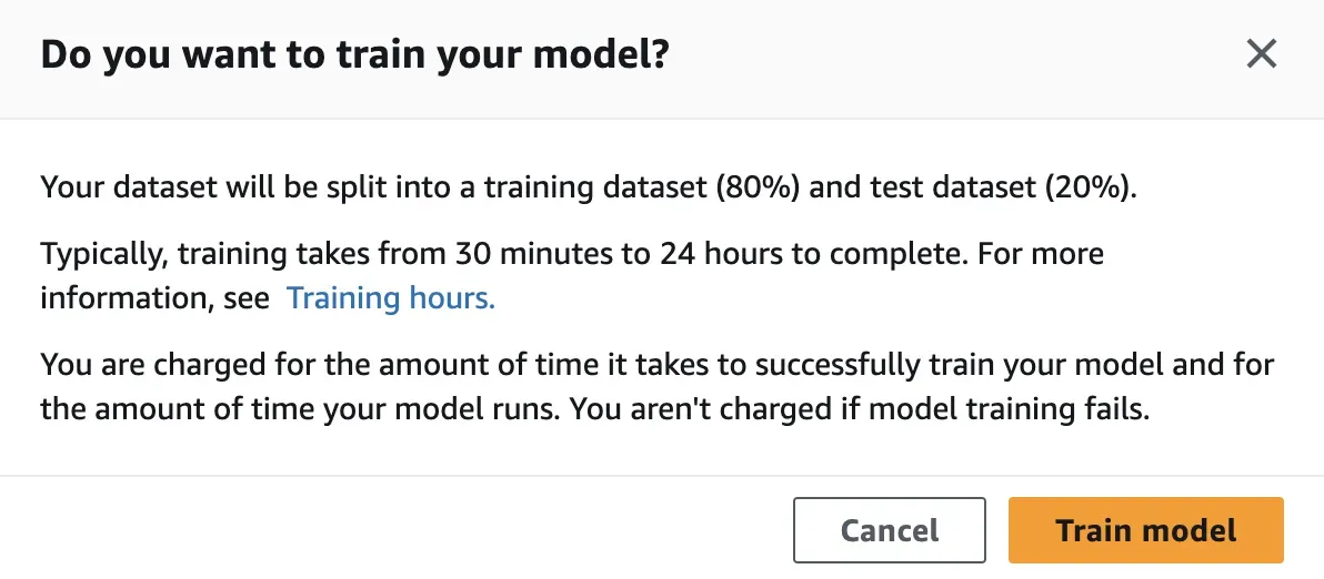 Fill out the required information to configure your model training, then continue to start training. A pop up will appear asking you whether you are ready to train your model. Read the disclaimer with regard to cost and training time. When you are ready, click “Train model”.
