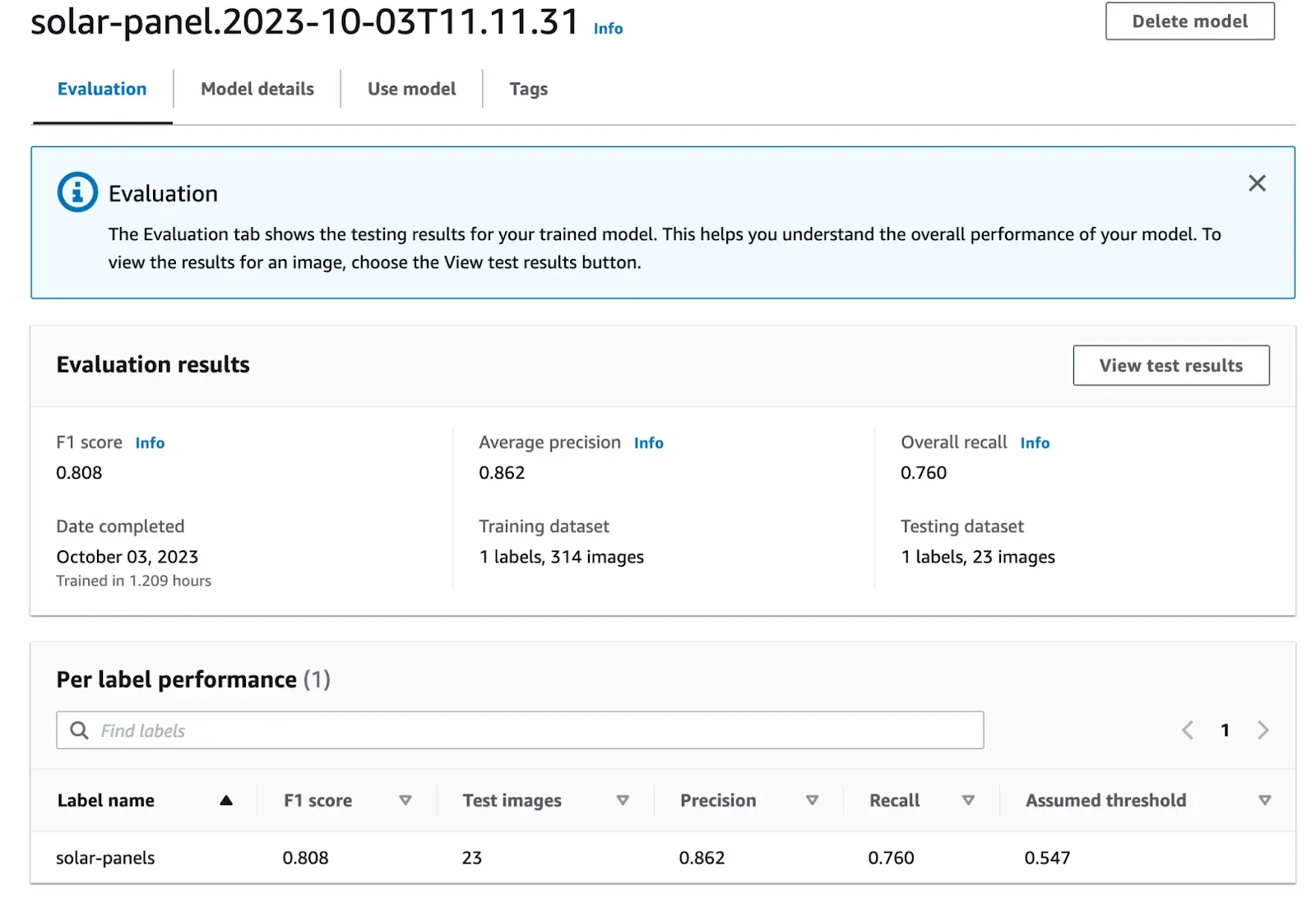 Once your model has been trained, you can view evaluation results in the Custom Labels dashboard. The evaluation results show F1 score, average precision, and recall all in aggregate, as well as at a class level.