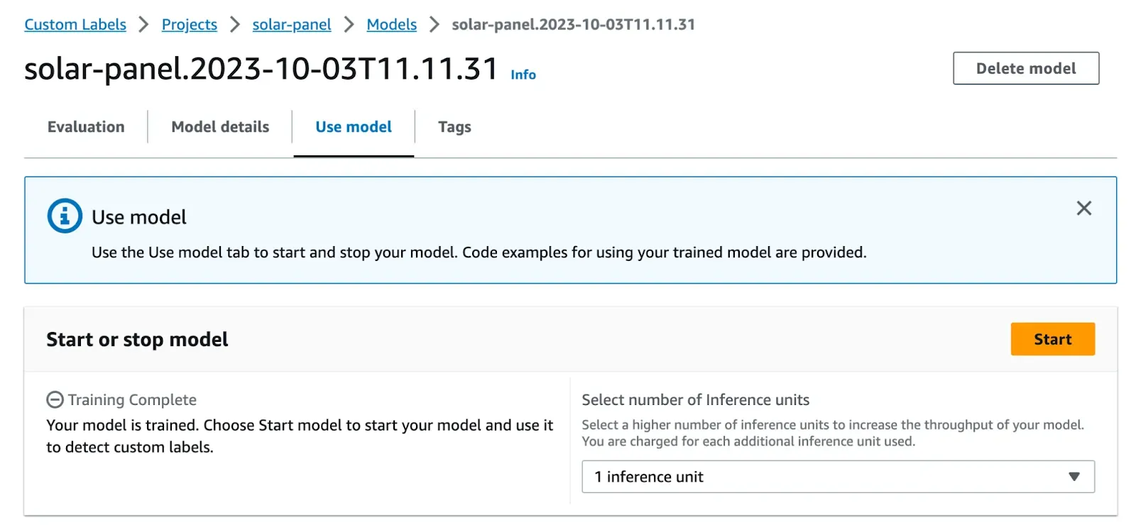 To test and deploy your model, click the “Use model” tab and configure how many inference units you want. For testing, “1 inference unit” (the minimum) is recommended. Then, click “Start” to start deploying your model.