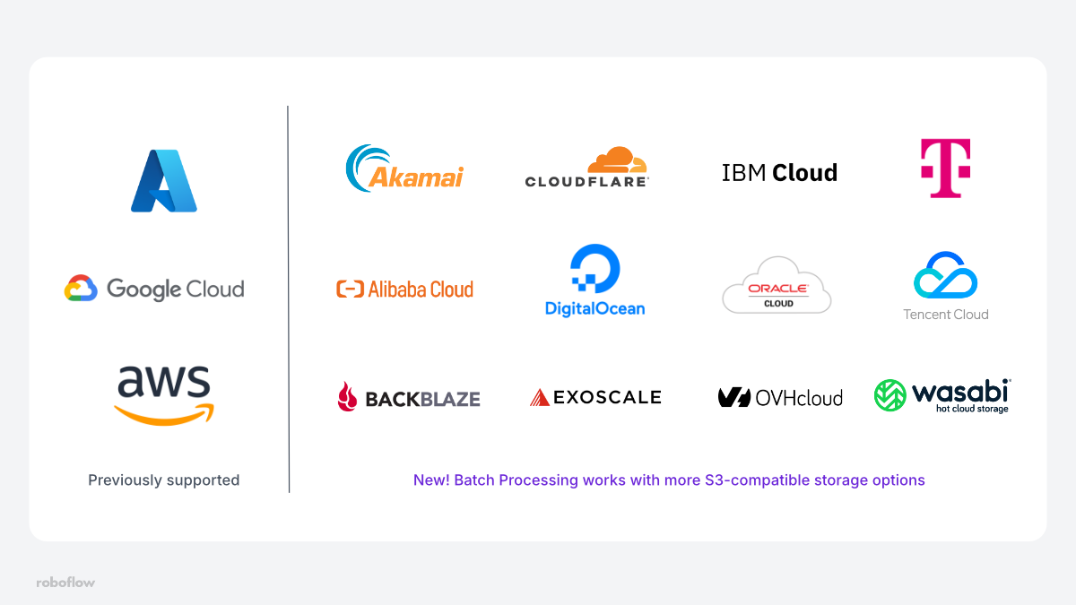 Roboflow Batch Processing now supports a wide array of S3-compatible providers, including popular options like Wasabi, Backblaze B2, Cloudflare R2, DigitalOcean, and Akamai, as well as regional and specialized solutions like OVHcloud, Telekom Cloud, Exoscale, Alibaba Cloud, Tencent Cloud, Yandex Cloud, IBM Cloud Object Storage, and Oracle OCI S3.