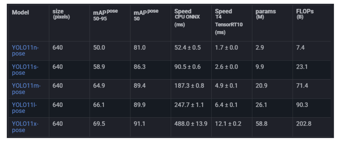 YOLO11 Pose strikes the best balance for most practitioners. It achieves 89.4% mAP@0.5 on COCO Keypoints while maintaining real-time inference speeds of 200+ FPS on standard GPU hardware like the NVIDIA T4. Its multi-size variant architecture (Nano through XLarge) allows you to match your computational budget, whether deploying on edge devices or cloud infrastructure.