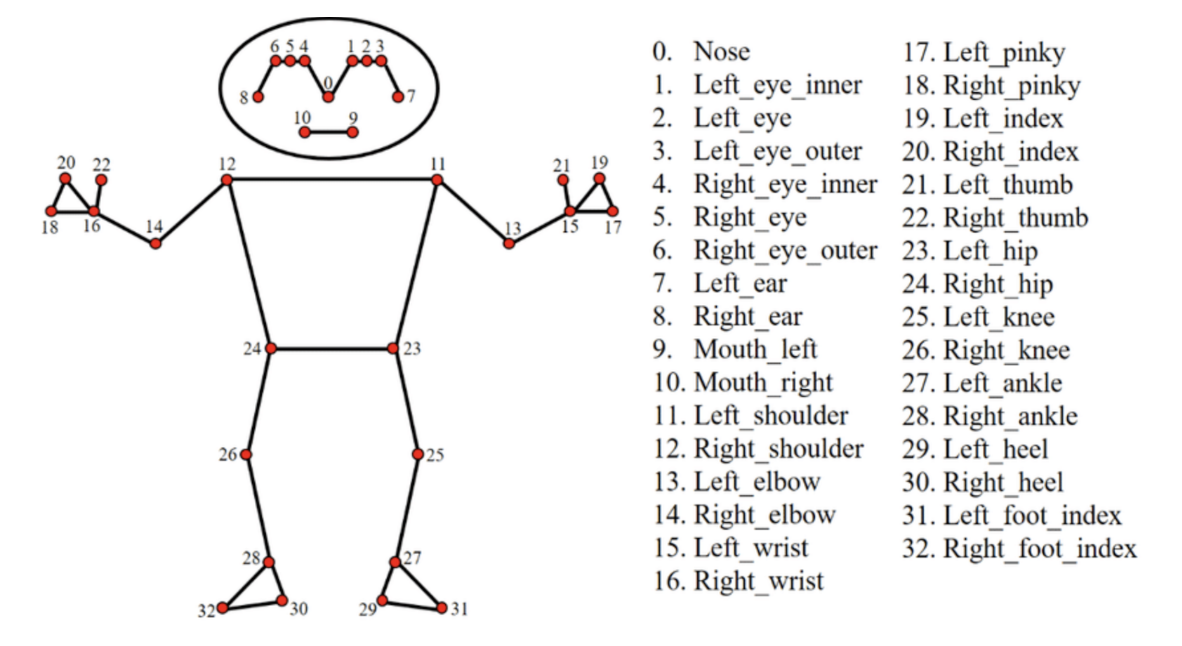 What distinguishes MediaPipe Pose is its comprehensive keypoint topology. Rather than limiting itself to the standard 17 COCO keypoints, MediaPipe Pose identifies 33 landmark locations across the entire body, including: