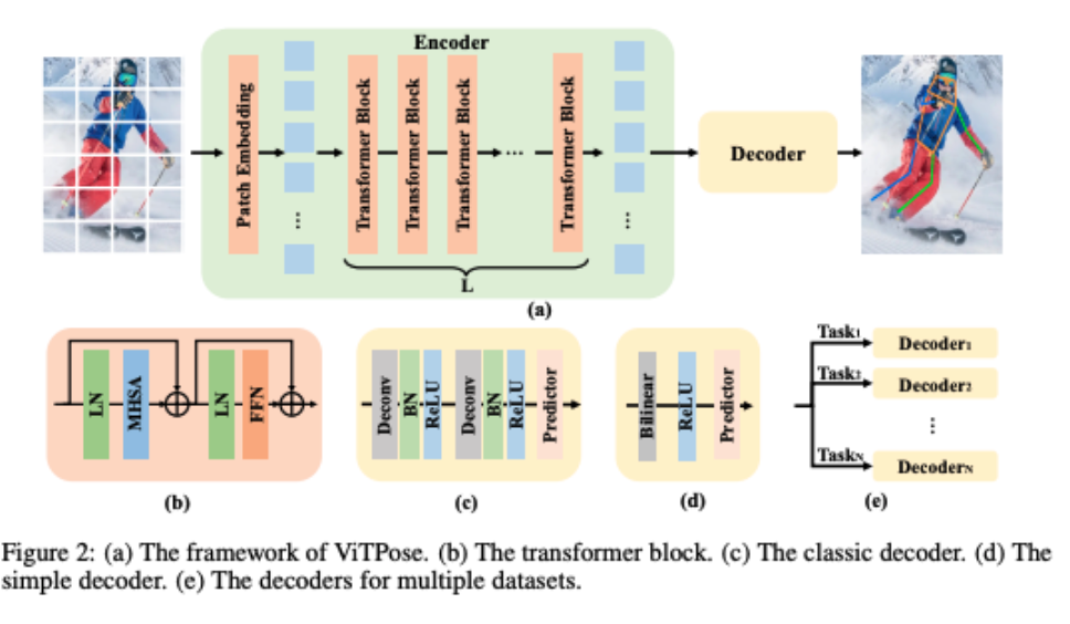 ViTPose employs plain, non-hierarchical vision transformers as backbones to extract features for a given person instance and a lightweight decoder for pose estimation. It can be scaled from 100M to 1B parameters by taking advantage of the transformers' scalable model capacity and high parallelism.
