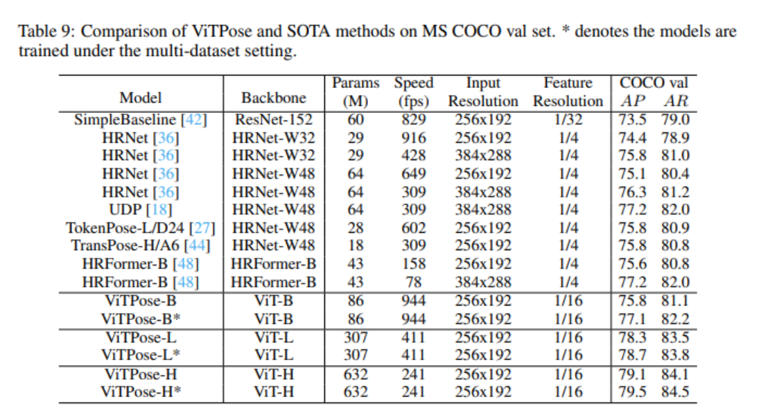 - Scalability: model sizes span small → huge (e.g., ViTPose-B ≈ 86M params up to ViTPose-H ≈ 632M params), so you can pick a variant to match compute limits.