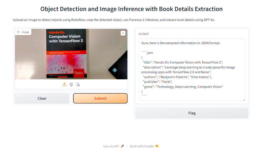 This is the final step. We will build a Gradio application that integrates the code from all the previous steps. Following is the code for detecting and processing text from an uploaded image. It initializes a Roboflow client to detect objects in the image (using the object detection model trained with Roboflow), crops the detected area, and runs text extraction using Microsoft's Florence-2 model. The extracted text is then processed by the GPT-4o model to identify and extract book details.