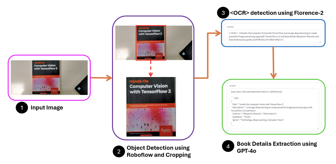 - The cropped image is processed using the Florence-2 vision foundation model. This advanced AI model accurately detects and extracts text from the book cover or spine.