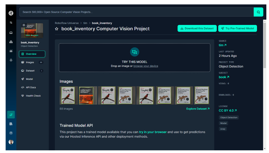 Our first step is to build the object detection model using Roboflow. You can quickly create and host a computer vision model using Roboflow by following getting started guide. In our example, we'll use Book Inventory model using Roboflow. Following image shows the Book Inventory project that I have built for this blog post. It contains images of book covers.