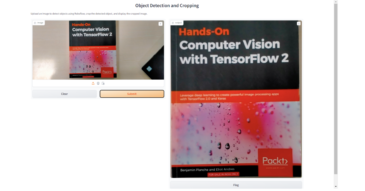 We will use this code to create a Gradio application which detects the book cover in an image (uploaded from computer or captured using webcam) and crop the region-of-interest (ROI). You can follow this guide to understand how to crop the ROI.