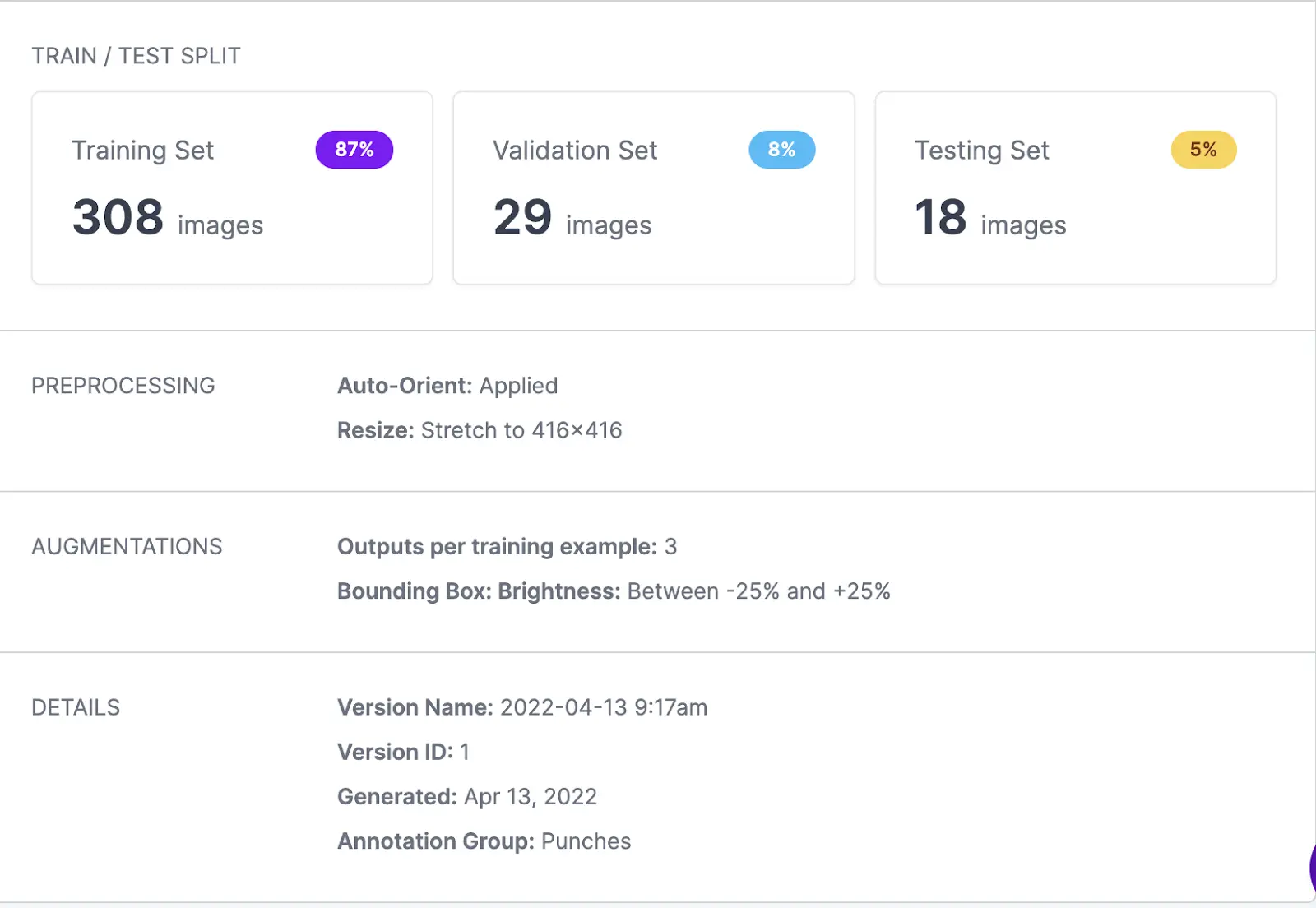 In the first model version, we applied some basic pre-processing and augmentations as well as added some brightness and ended up with 355 total images for my model.
