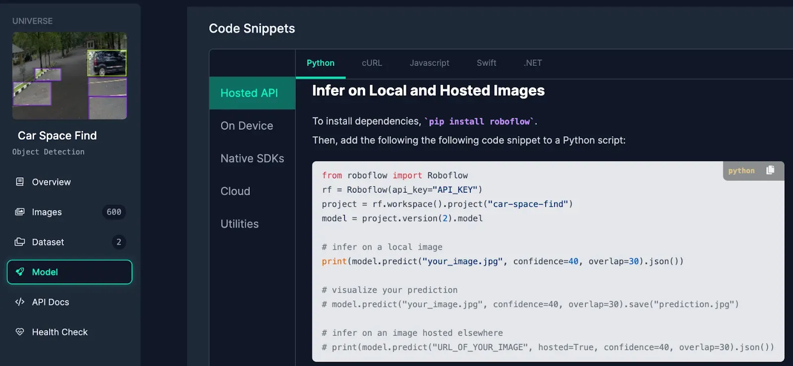 In the code, you'll find the model ID and version number, it's important to note them. In our example, the model is identified as "car-space-find" and it is the second version of the model. These details will help us when we put together our inference script.