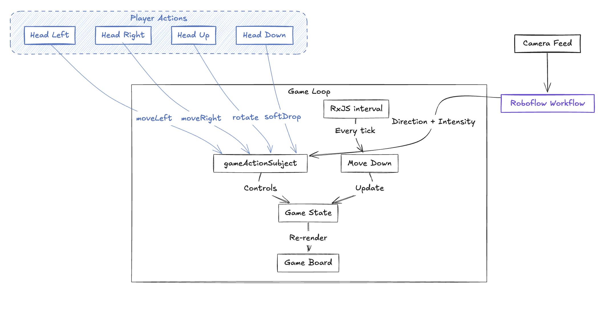 To catch the player actions and dispatch them to update the game loop, we need to look into the camera feed and interact with it. This is done in the CameraPreview component. It handles three tasks: