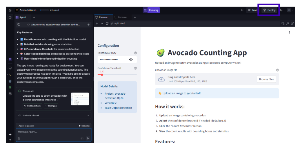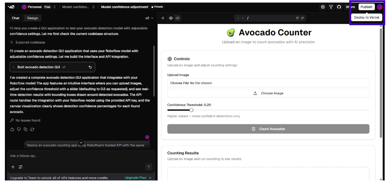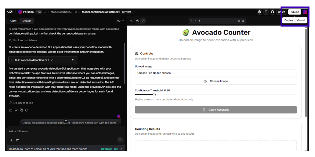Example: “Adjust the avocado detection model to use a 0.6 confidence threshold and process 10 images.” The LLM in v0/Replit runs the updated app directly, displaying results (e.g., counts and visualizations) without you coding. For real-time apps, prompt “Optimize for video inference at 30 FPS” to adjust settings for speed.