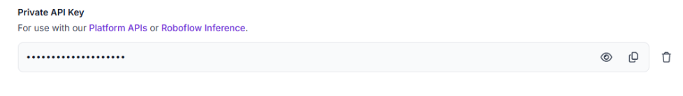 This key authenticates access to Roboflow’s hosted API for inference.