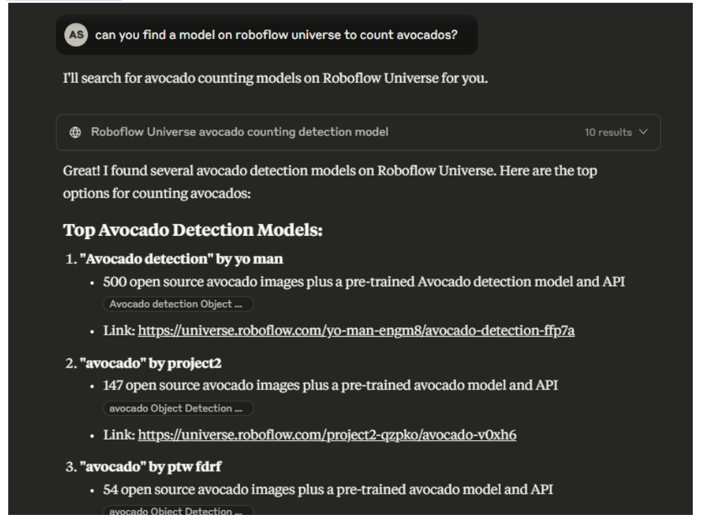 Example Prompt for Claude Sonnet 4.0: “Can you find a model on Roboflow Universe to count avocados?”