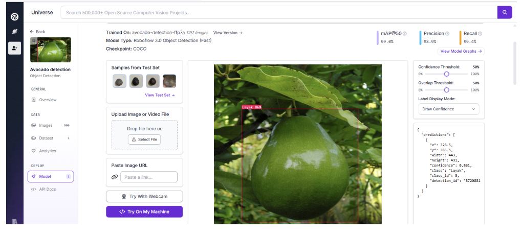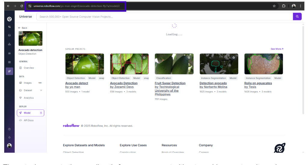 Visit the recommended model’s URL (e.g., https://universe.roboflow.com/yo-man-engm8/avocado-detection-ffp7a), navigate to the “Model” section, and copy the model URL or note the model ID (avocado-detection-ffp7a/2). Test it by uploading a sample image (e.g., a photo of avocados on a table) in Universe’s web interface to verify detections. No code is required, just ask the LLM and confirm on the website. Tip: Use Universe’s filters (e.g., “Has a Model”) and check model metrics like mAP or precision to choose the best fit. For avocados, a larger dataset (500 images) typically ensures better accuracy across lighting conditions or angles.
