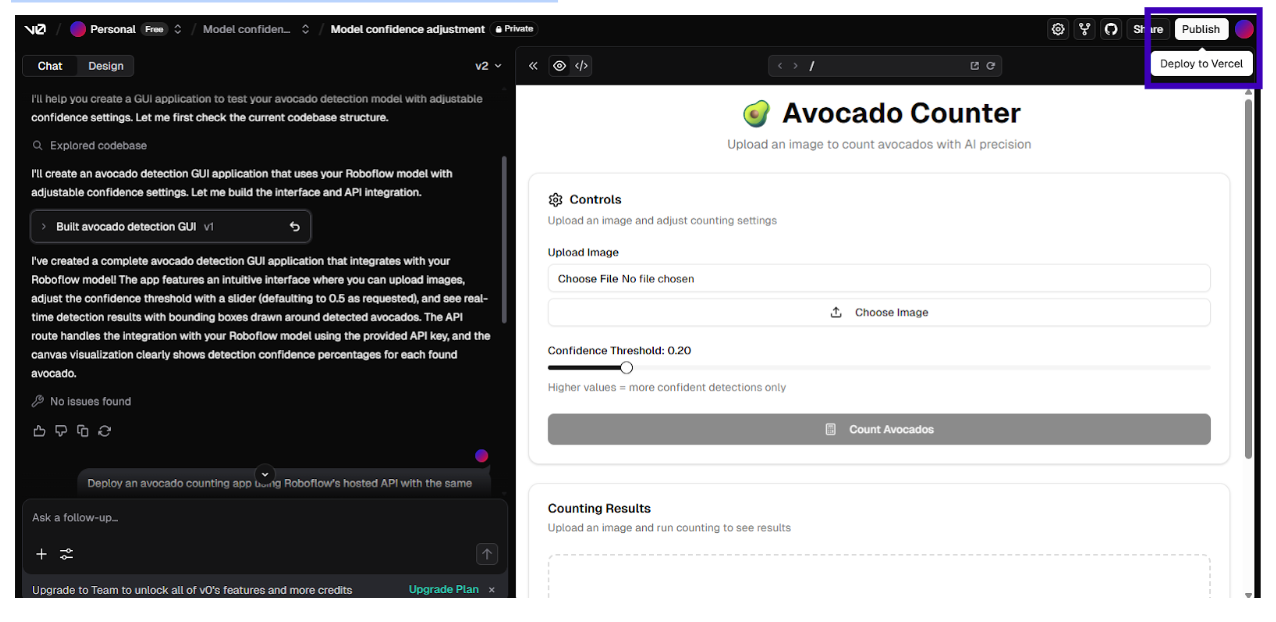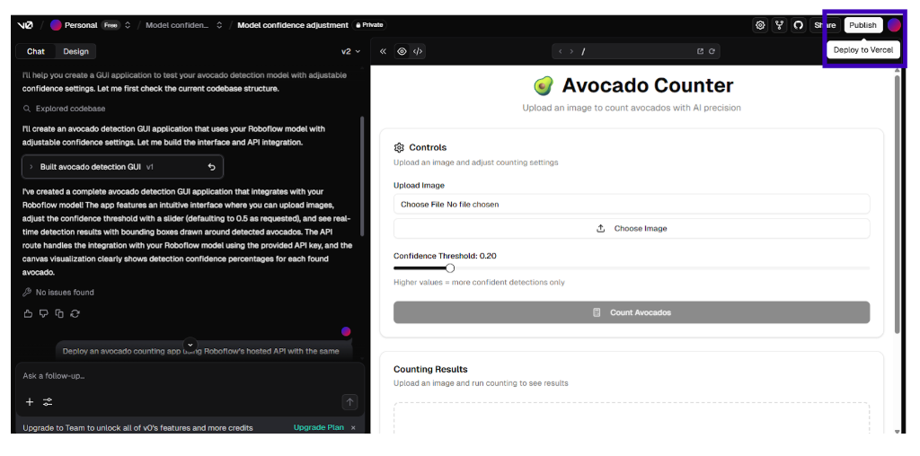 Sample Prompt for Vercel v0:"Launch an avocado-counting app using Roboflow's API with model ID avocado-detection-ffp7a/2, confidence 0.2, and my API key [insert your key]."