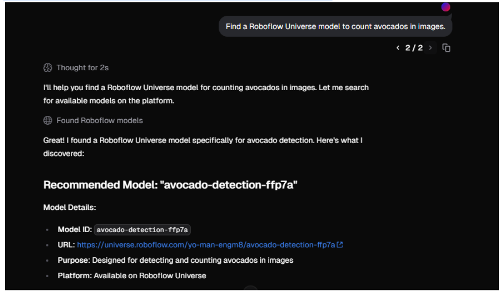 - Clear Prompts: Specify the model ID (e.g., avocado-detection-ffp7a/2) to prevent confusion.