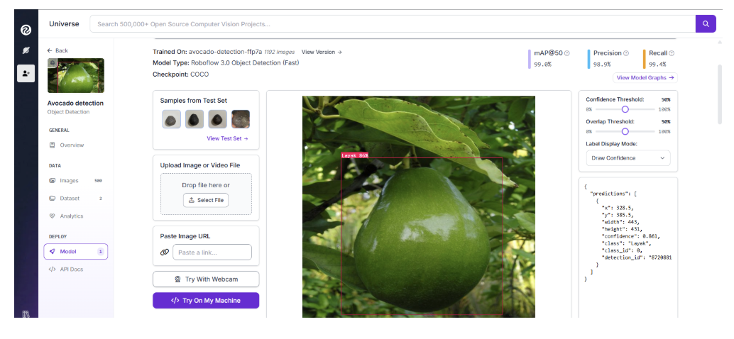 Test it by uploading a sample image (e.g., avocados in a crate) on Universe's web interface to validate detections. Use filters like "Has a Model" and review metrics like precision or mAP to select a suitable model.