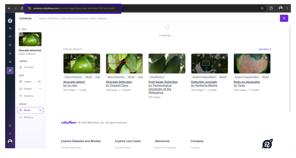 Vercel v0 might return a model URL like https://universe.roboflow.com/yo-man-engm8/avocado-detection-ffp7a. Visit the model's page, go to the "Model" tab, and note the model ID (avocado-detection-ffp7a/2).