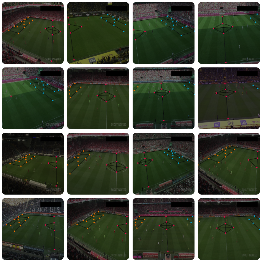 Before we start labeling the dataset, we need to determine which characteristic points of the pitch we want to detect. Since the camera can pan and zoom in and out freely, following the action of the game, we rarely see the entire field. Therefore, we need to define our points densely enough so that at any time - even when the camera is tightly following the action - at least four characteristic points are visible. This requirement comes from homography, which we will use to transform the perspective later in this tutorial. We ultimately defined 32 characteristic points, which were then manually annotated on the uploaded images.