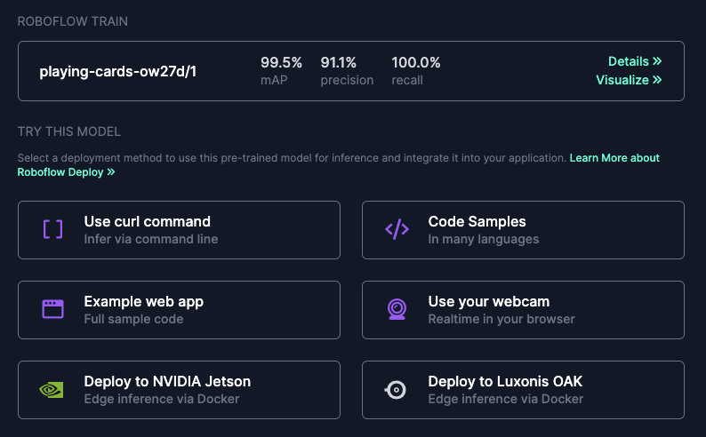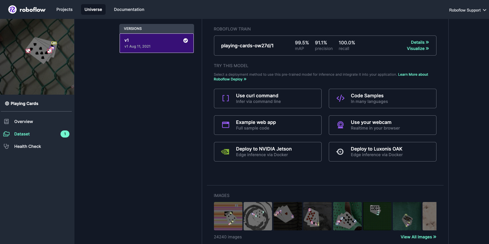 You will notice that on Roboflow Universe, a model has already been trained on the playing cards dataset, with various deployment destinations.