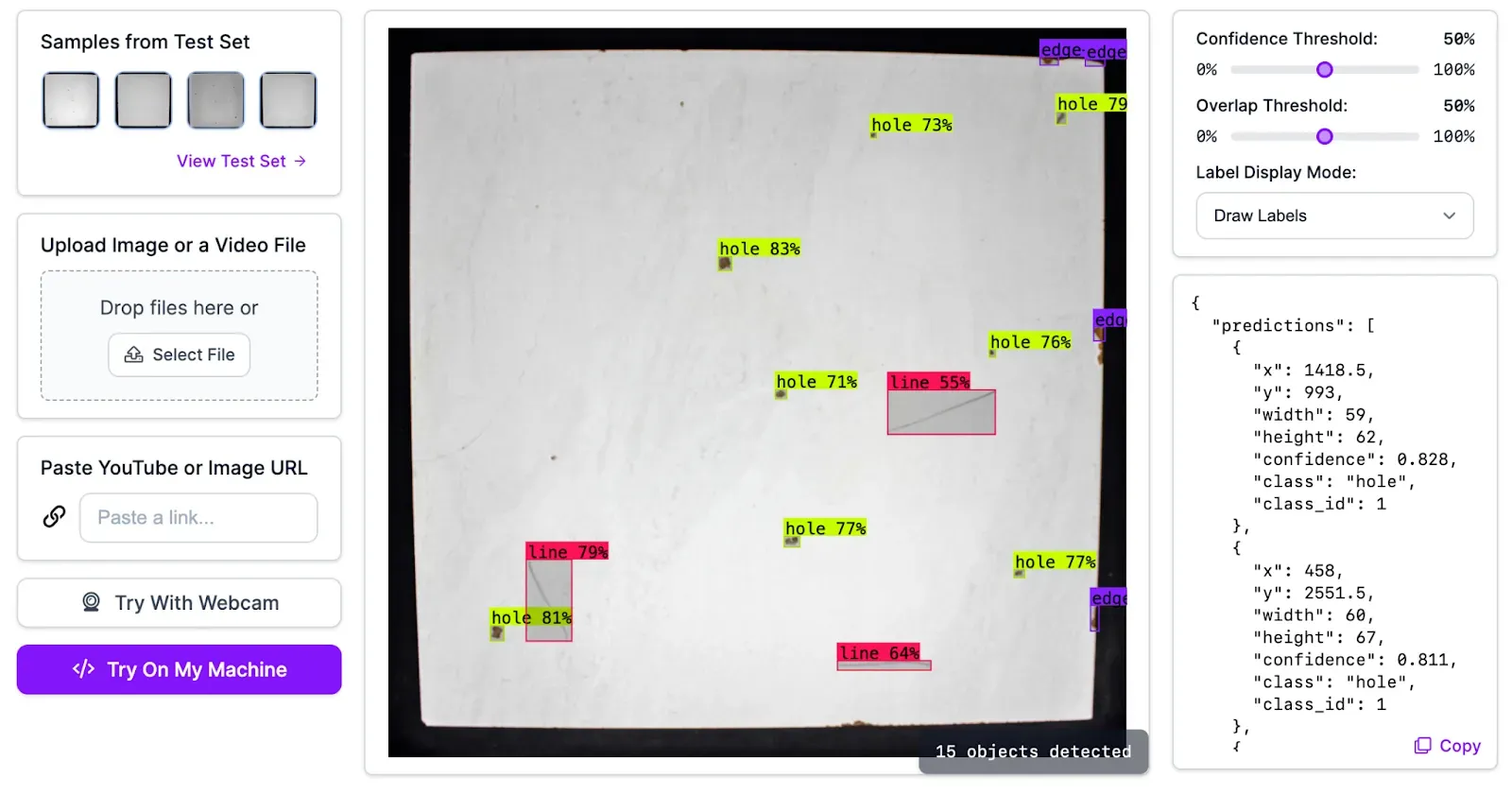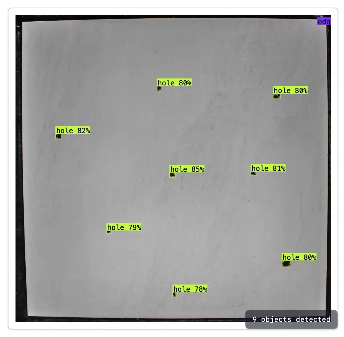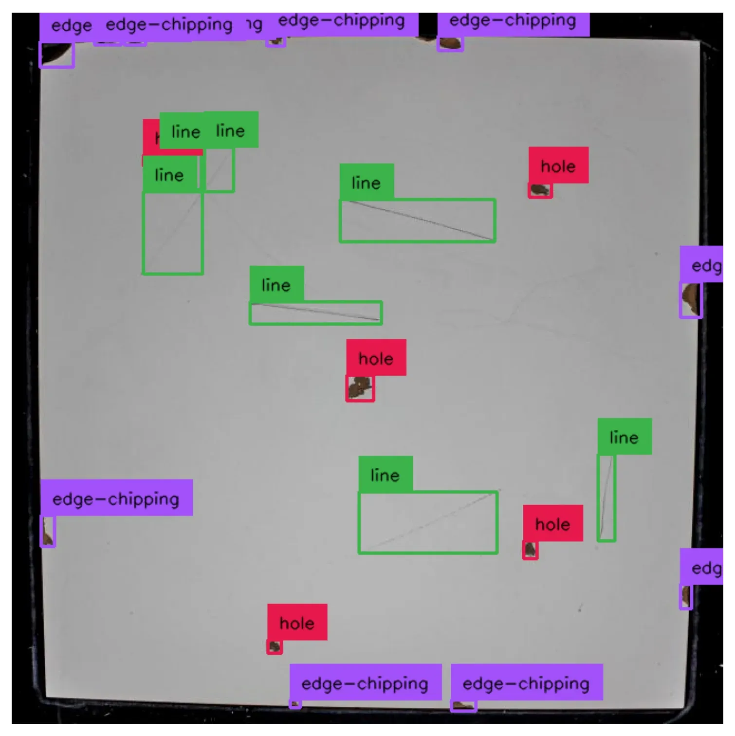 Here is an example of the model working to identify holes, lines, and edge cracks: