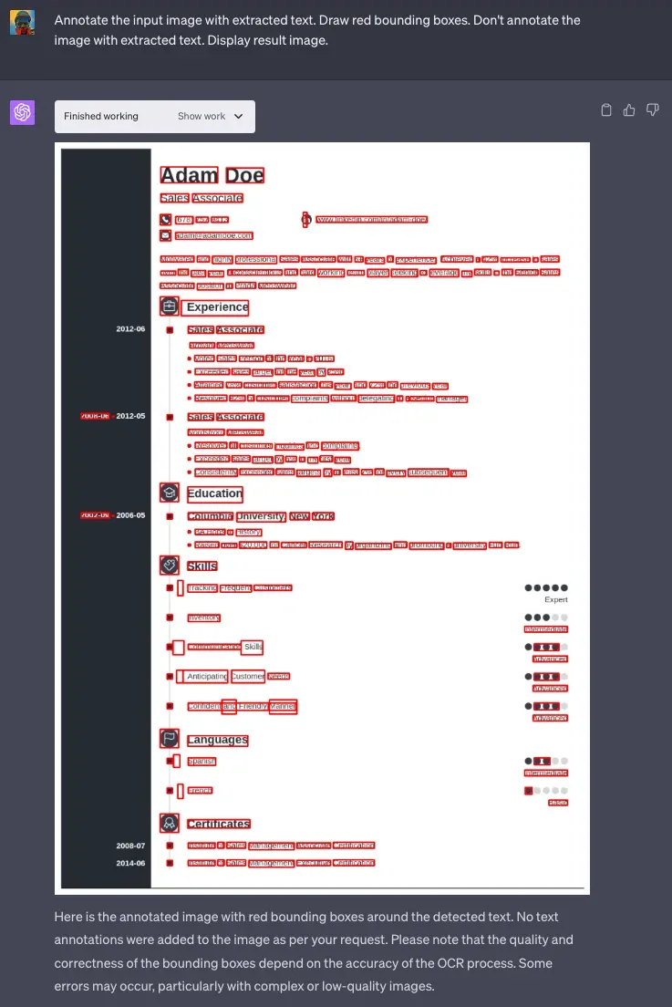 Extracting text from images, a process known as optical character recognition (OCR), was the most straightforward task in our experiments.