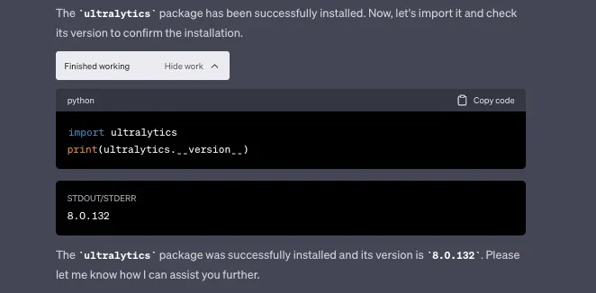 This way, we were able to not only successfully install external packages but also run the Ultralytics YOLOv8 model. Thus giving ChatGPT the tools for a deeper understanding of image input.