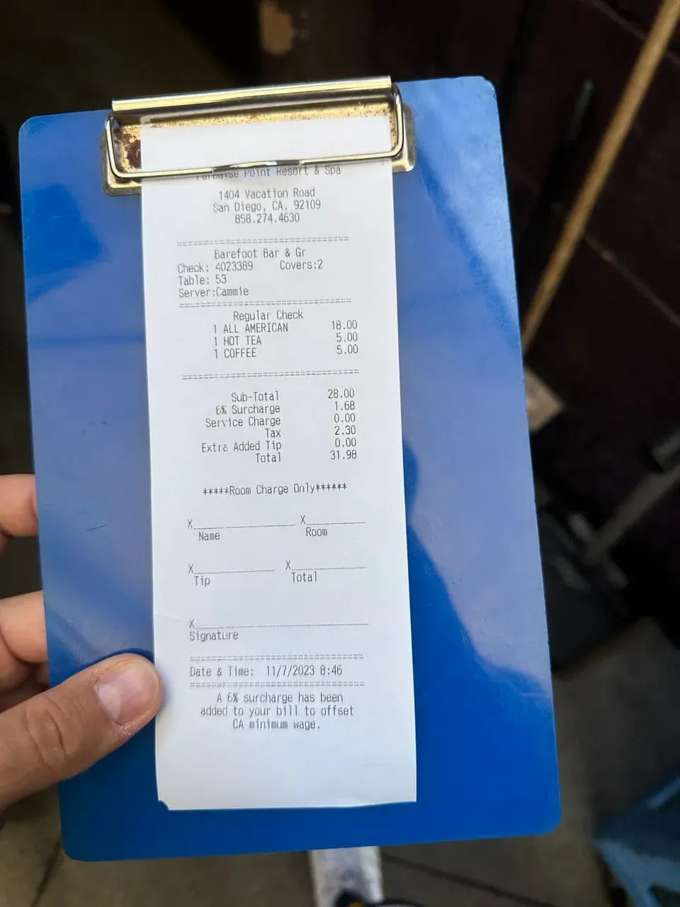 According to the receipt, you paid a total of $5.00 in tax, which includes a $1.68 surcharge and a $0.00 "Extra Added Tip Tax"