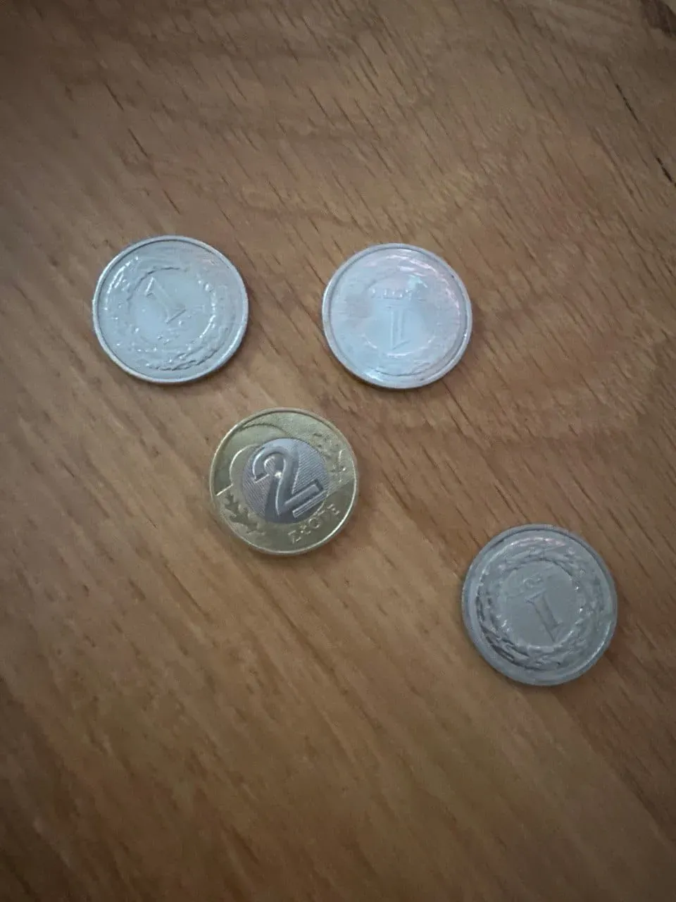 Based on the four coins shown in the image, you have 61 cents (or 0.61 Polish złoty). The coins appear to be:\n\n1 coin of 1 grosz (0.01 PLN)\n1 coin of 20 groszy (0.20 PLN) \n2 coins of 20 groszy each, totaling 40 groszy (0.40 PLN)\n\nTogether, the four coins sum to 61 groszy, which is equivalent to 0.61 Polish złoty.