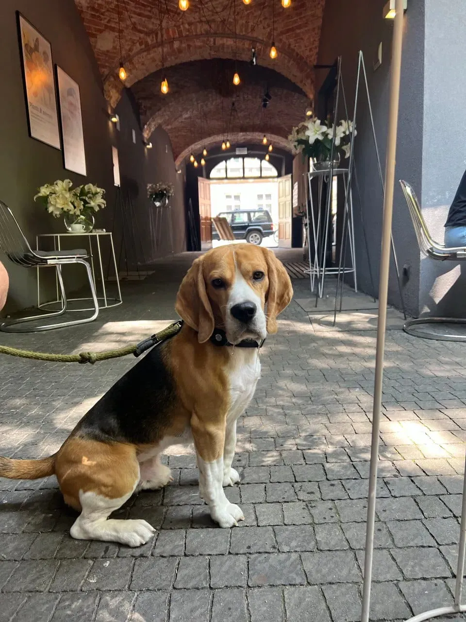 The image shows a beagle dog sitting on a brick patio or walkway near the entryway of a building. The entryway has an arched brick ceiling with hanging light bulbs, providing a warm and inviting atmosphere. In the background through the archway, a parked vehicle can be seen outside.\n\nThe coordinates for the bounding box around the dog are approximately:\n\nx_min: 550\ny_min: 470\nx_max: 1020\ny_max: 1080\n\nThe coordinates are based on the full resolution 1440x1080 pixel image provided.