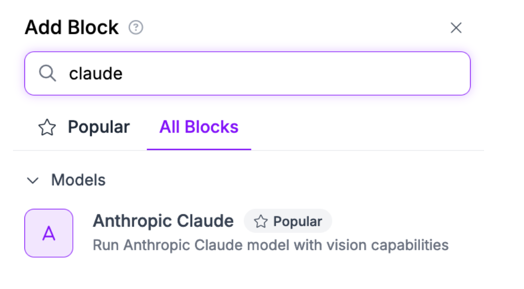 To use Claude, Gemini, or GPT-4o in Workflows, you need to add the block that corresponds with the model that you want to use.
