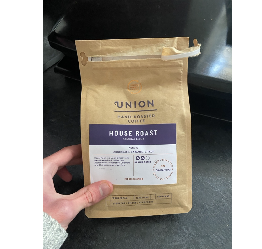 "output": "{\n \"name\": \"Union House Roast Original Blend\",\n \"roast date\": \"08/09/2020\",\n \"origin\": \"Asoproaaa cooperative, Colombia and Chirinos cooperative, Peru\"\n}",