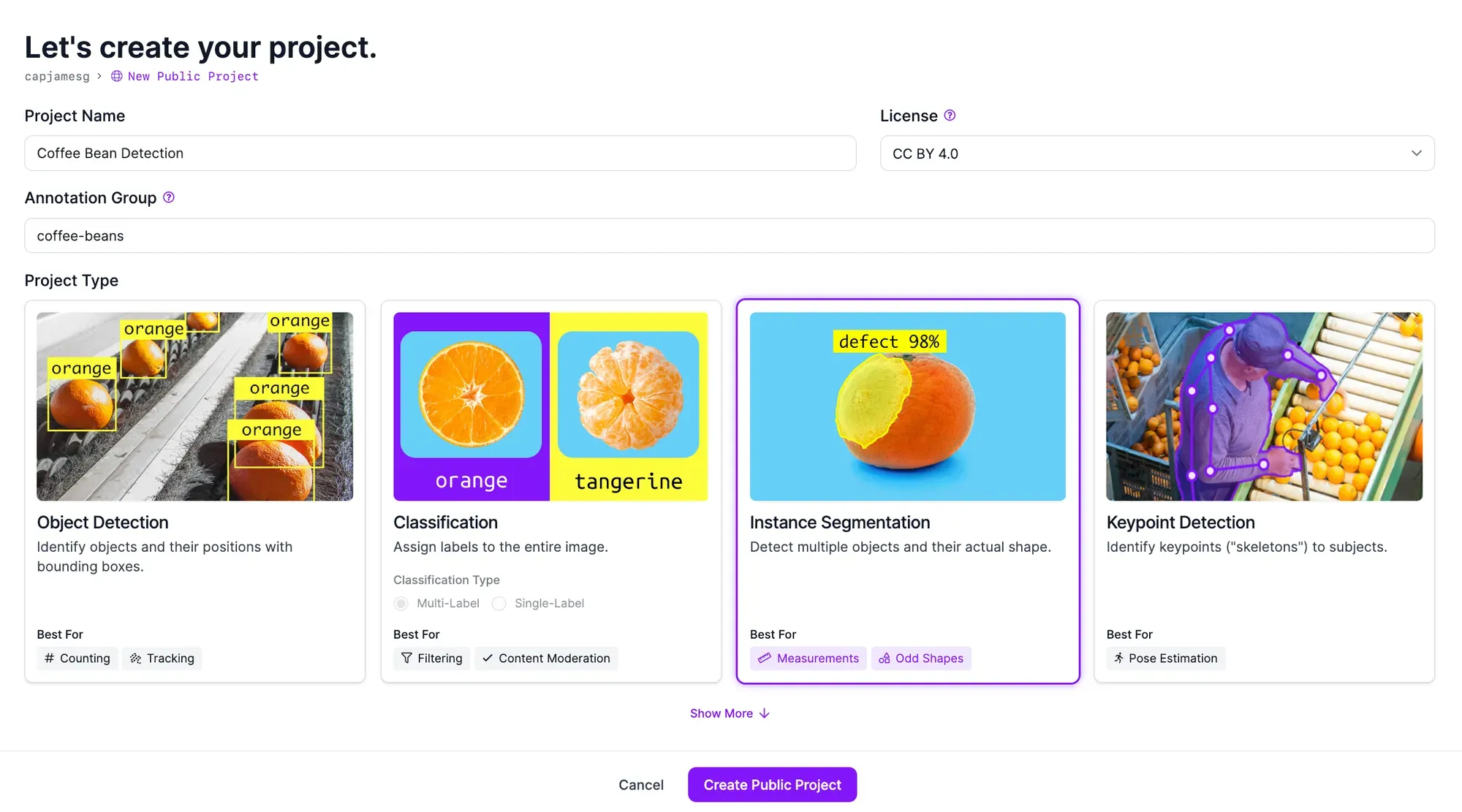 To get started, create a free Roboflow account. Go to your Roboflow dashboard, then click the “Create Project” button. You will be taken to a page where you can create a new project. On this page, set a name for your project and choose the “Instance Segmentation” project type.