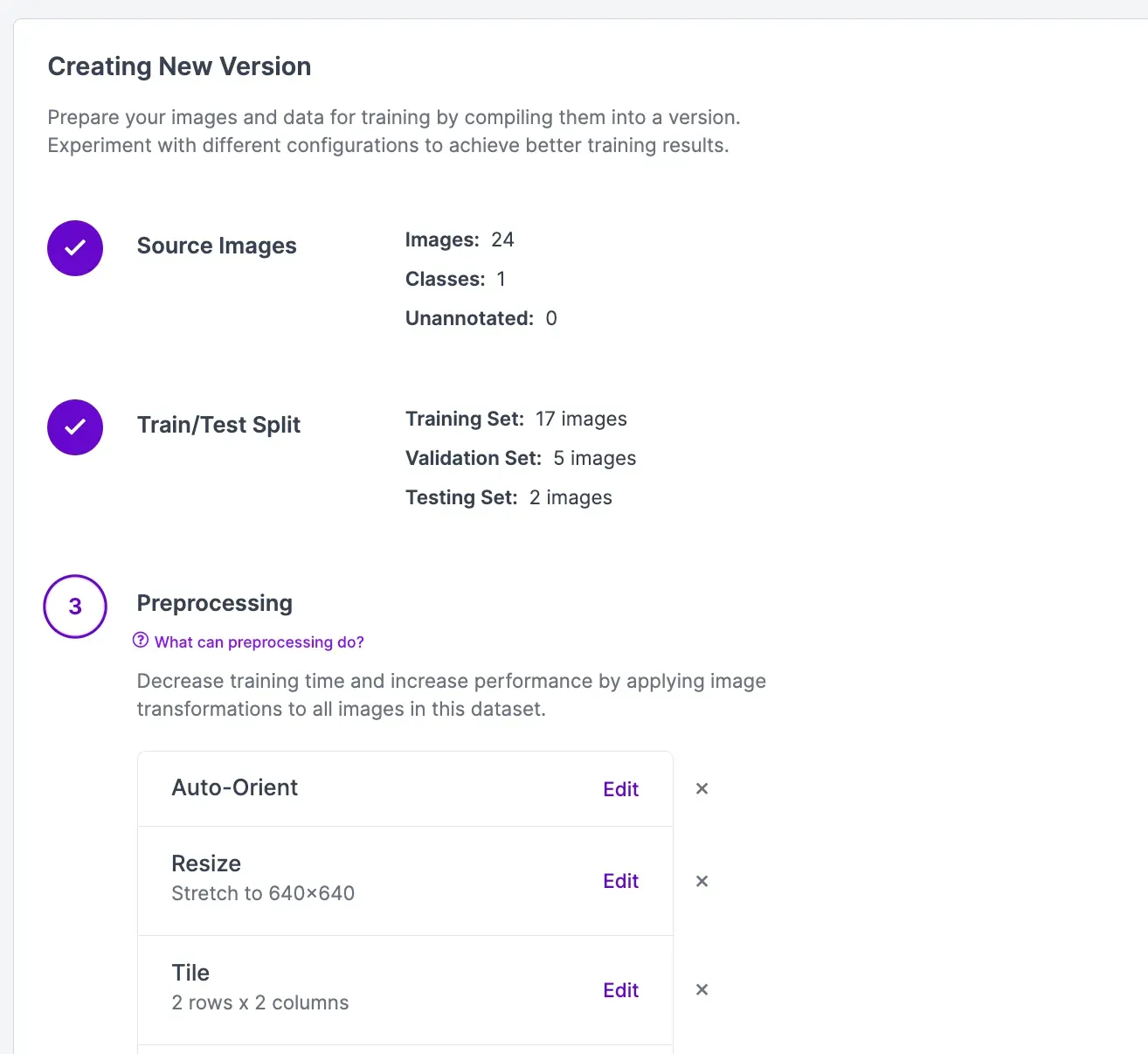 You can apply preprocessing steps and augmentations to your dataset version. Preprocessing steps prepare your images for training. Augmentations let you generate new images using your dataset that may help improve model performance.