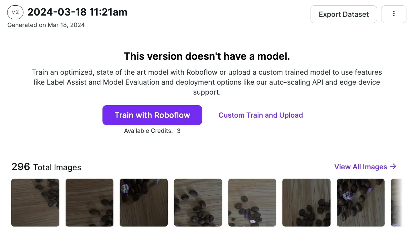 With your dataset labeled and a dataset generated, you are ready to train your coffee bean inspection model. To do so, click the “Train with Roboflow” button on your dataset page.
