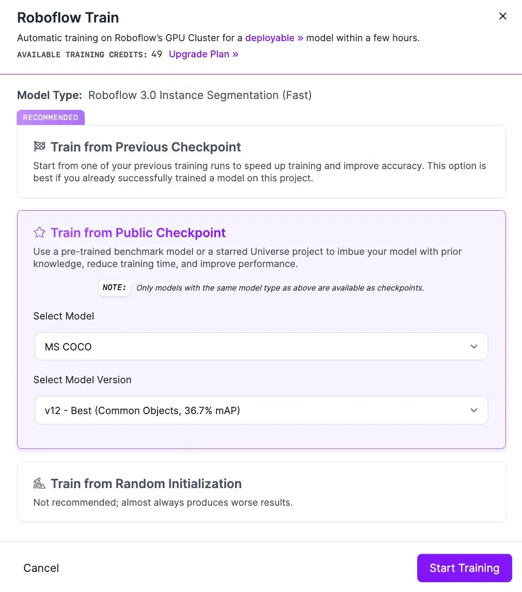 We always recommend training from this checkpoint for your first model version. In future versions, you can train from previous versions of your model to refine model performance. You should only use a previous model version as a checkpoint if your model is already performing well, otherwise you will be training from a suboptimal checkpoint. This will negatively impact model performance.