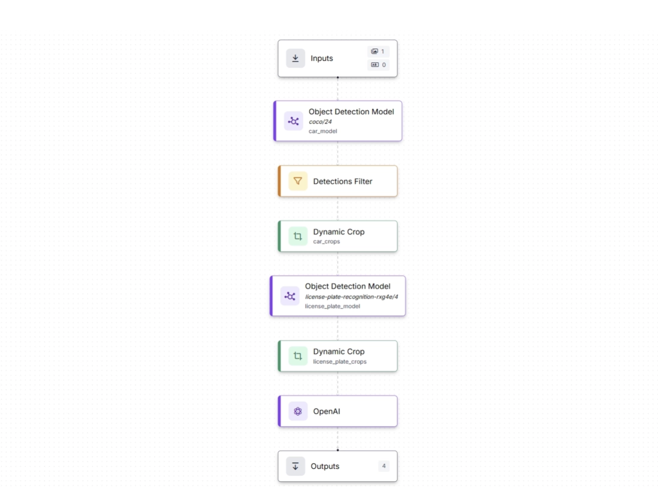 The workflow below demonstrates this end-to-end pipeline: edge-based object detection identifies vehicles and license plates, crops the relevant regions, and forwards them to the cloud, where advanced language-vision model (Open AI’s GPT-4 Vision) extract and interpret the license plate text: