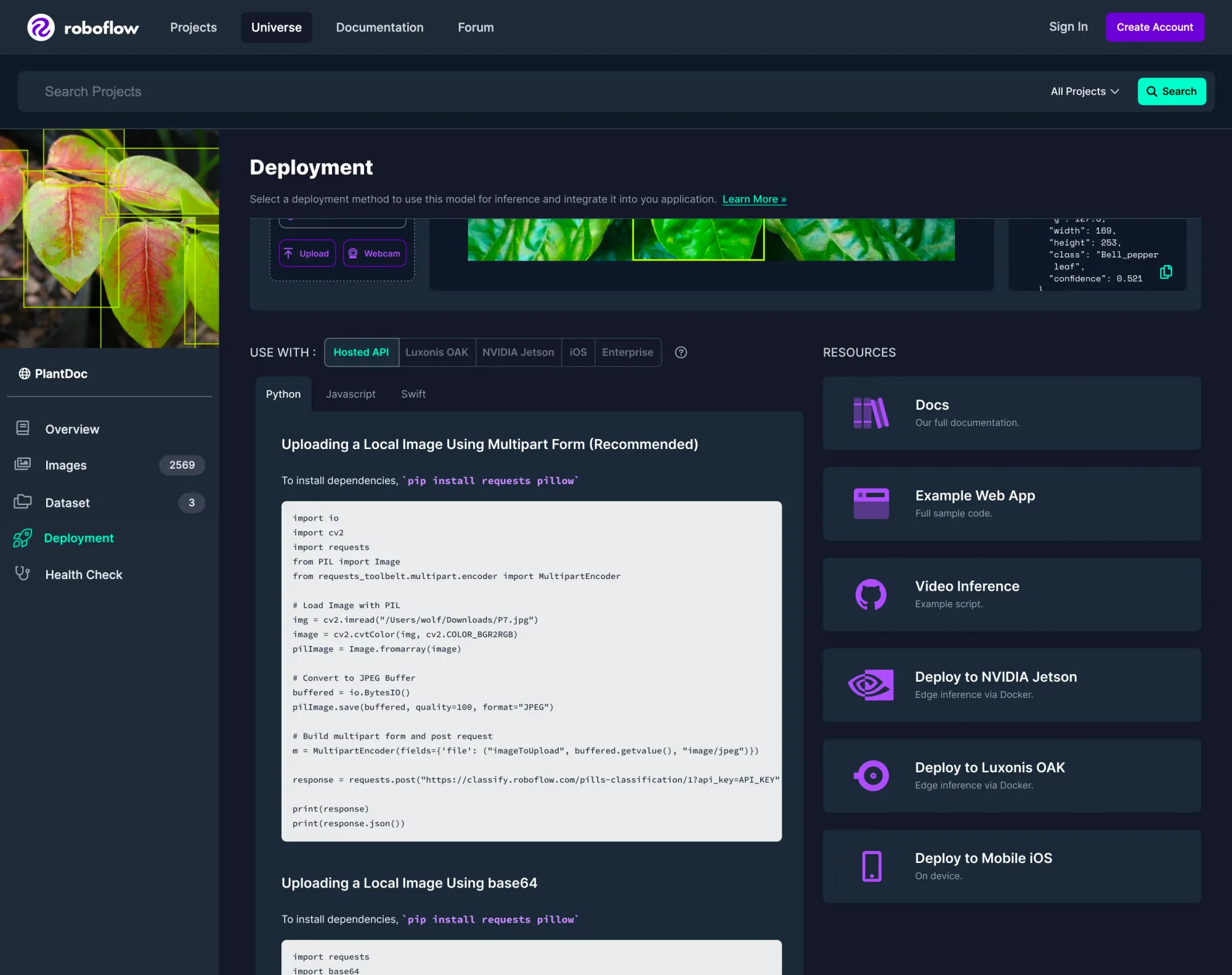 Deploy pre-trained models immediately to production via Hosted API, Luxonis OAK, NVIDIA Jetson, and Mobile (iOS).
