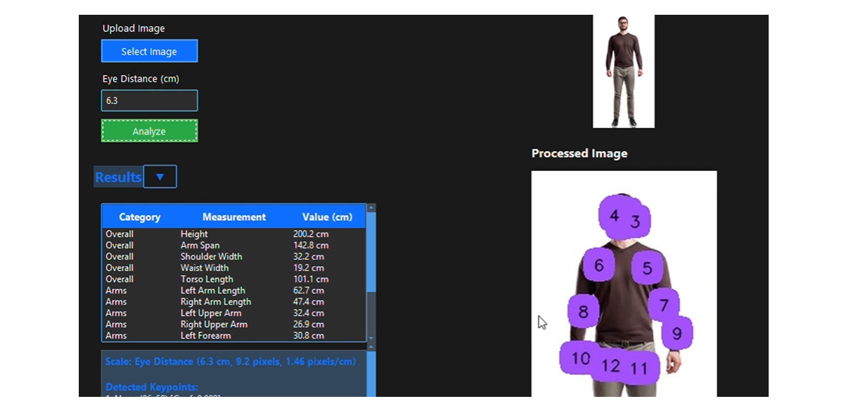 A vision system that detects keypoints (e.g. shoulders, hips, ankles, eyes) on the human body in an image, and then computes physical measurements (height, arm span, shoulder width, limb lengths) based on those keypoints.