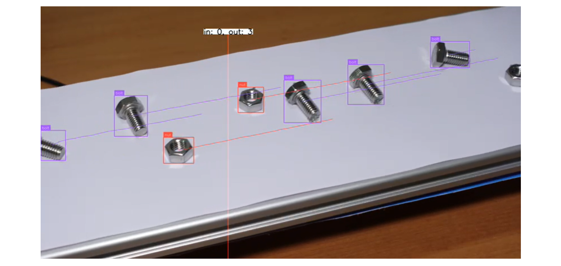 This project builds a vision system that detects objects (e.g., bolts, nuts, or small components) moving along a conveyor belt, and counts how many cross a defined region or pass a line.